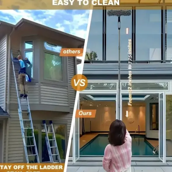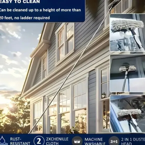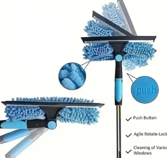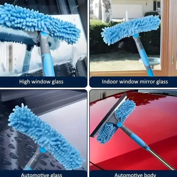 Denna fönsterskrapa med teleskopskaft fungerar både som tvättare och skrapa, vilket gör rengöringen enkel och effektiv. Den starkt vattenabsorberande chenille-tygöverdraget fångar upp smuts och vatten snabbt.