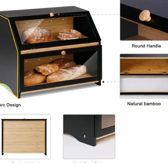 【 STABIL, STILFULL OCH LÄTT ATT MONTERA 】 Ett perfekt val för att förvara och visa upp ditt bröd och dina bakverk i denna brödförvaring för köksbänken, tillverkad av starkt bambuträ. Den eleganta svarta färgen och den lantliga farmhouse-designen bidrar till en rustik inredning. Skruvmejsel ingår i paketet för enkel montering. Patenterad produkt, kopiering är ej tillåten.