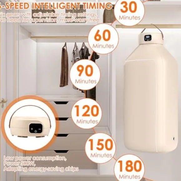 Snabbtorkning: Den kompakta torktumlaren kan enkelt styras och ställas in med den digitala LED-displayen och smarta touch-inställningarna. Häng bara torktumlaren på en stång och använd den. Minitorktumlaren har en förinställd torktid markerad på maskinen. Du kan välja önskad torktid och använda timerknappen för att justera inställningen så att den matchar dina specifika torkpreferenser.