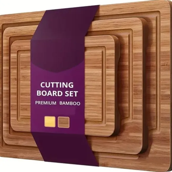 Uppgradera ditt kök med detta set av bambuskärbrädor i massivt trä – hållbara, eleganta och oumbärliga i varje hem!