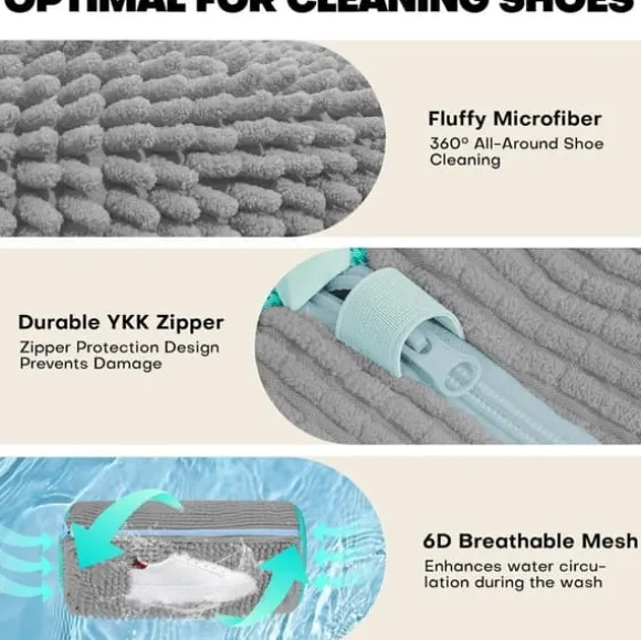 Utrustad med tusentals fluffiga mikrofibertrådar och ett smart nätmönster rengör tvättpåsen skonsamt men effektivt i alla riktningar. Den djuprengör skorna utan att du behöver skrubba och skyddar samtidigt mot slitage under maskintvätt. Perfekt för sneakers, vardagsskor och barnskor.