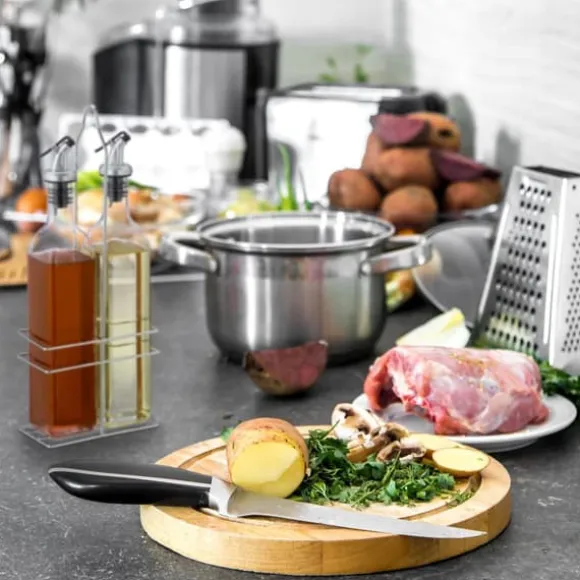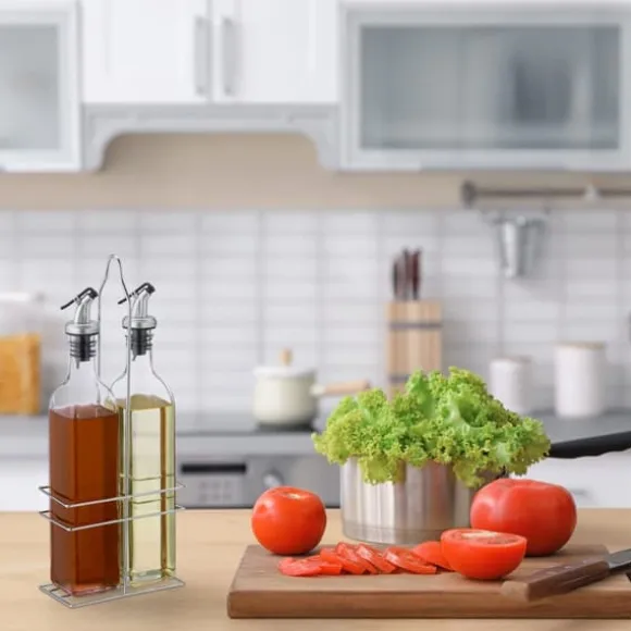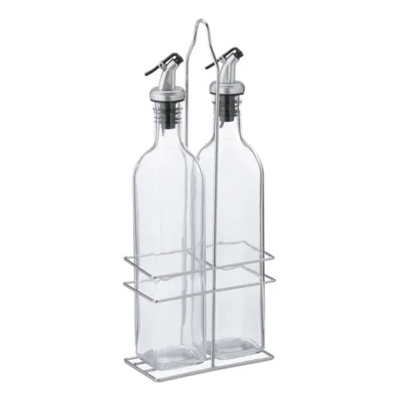Detta eleganta olja- och vinägerdispenser-set är perfekt för både matbordet och köket, och erbjuder ett stilfullt sätt att förvara och servera dina favoritkryddor. De transparenta glasflaskorna gör det enkelt att se innehållet, medan de droppfria piparna säkerställer användning utan spill. Setet levereras med en robust metallhållare för smidig förvaring och presentation.