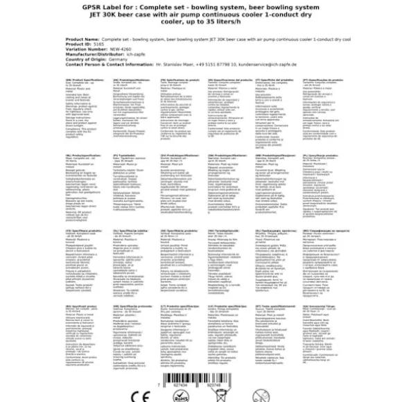 Underräknare komplett set – Öltapp – JET 30K dispenser med luftpump en linje torr kylare, 30 liter/h Består av: •JET 30K öllåda med luftpump flödeskylare 1-rads torrkylare, upp till 35 liter/h•1x utmatningspelare / dispenser modell Tower, matt borstad, 1- leitig•1x rengöringsadapter 30 mm•1x ölslang 7 mm komplett, färdig , 3,0 m•1x tryckluftsslang komplett John Guest 5/16 till 3/4 skruv för fastskruvning på kranhuvudena•1x ölslang komplett John Guest 3/8 till 5/8 Skruva fast för att skruva på kranhuvudena•1x kranhuvuden valfritt (utan kranhuvuden, 5 liters adapter, platt, kombination, Köpi, triangulär, korg) Öltapp – JET 30K dispenser med luftpump en linje torr kylare, 30 liter/h Öltapp – JET 30K dispenser med luftpump en linje torr kylare, 30 liter/hÖlbox, Genomströmningskylare, Torrkylare 3 minuter att packa upp… 2 minuter att ställa upp… 1 minut att ansluta = oändligNjutning utan CO2 En kall, klar, nyligen tappad öl – du har förtjänat det! Ölkylaren JET 30K är avsedd för professionell kylning och servering av utmärkt kyld öl, utan användning av CO2 tack vare integrerad luftpump för tryckproduktion. Avsedd för användning hemma, på trädgårdsfester och för små kommersiella ändamål. •Reglerområde+2 till +10 grader•Effekt:30 liter/timme vid 10°C TD•Kylteknologiär 45% mer effektiv•Klar att användapå endast 2-4 minuter Om termostaten ställs in på max kommer termoblocket (efter cirka 10 minuter) ackumulera en hög mängd energi och möjliggöra servering av flera kylda öl i följd.Kyltekniken i JET 30K-dispensern är cirka 45 % effektivare än den elektriska strömförbrukningen.Ölet kyls ner till kranen.Kylslingorna är tillverkade av rostfritt stål och är därför stabila och hållbara. De använda materialen uppfyller de högsta hygienstandarderna och möjliggör lång livslängd för kylaren. JET 30K – Stark och snabb som en jet Med sin kraftfulla kylprestanda och perfekta dimensioner är Öltapp JET 30K en av de ledande bords-/undervåningskylarna på marknaden. Kylprestanda från 40 till 60 glas (0,5 liter) utmärkt kyld öl per timme, Den kraftfulla kompressorn JET 30K säkerställer minimal energiförbrukning och utmärkt kyld öl utan att skumma och utan CO2-flaska. Genomströmningskylare JET 30K – Effektivitet, Prestanda, Njutning Termoblocket för JET 30K Öltapp har hög energikapacitet, vilket möjliggör servering av perfekt kyld öl på endast 2-4 minuter. Om termostaten ställs in på max kommer termoblocket (efter cirka 10 minuter) ackumulera en hög mängd energi och möjliggöra servering av flera kylda öl i följd. Kyltekniken i JET 30K-dispensern är cirka 45 % effektivare än den elektriska strömförbrukningen.Ölet kyls ner till kranen.Ingen CO2 används – integrerad luftpump säkerställer problemfri och mobil tappningKylslingorna är tillverkade av rostfritt stål och är därför stabila och hållbara JET 30K Genomströmningskylare – Tekniska data Den ädla JET 30K torrkylaren med en vikt av endast 14,5 kg är utrustad med en 7 mm ledning. •Mått: B/D/H/ 167/281 / (inklusive droppskål) / 368 mm•Spänning: 230V, 50 Hz, 267W, 1,16A•Kompressor: 1/8 hk•Ledning: 1 x Öl•Hölje: Metall, pulverlackerat, rostsäkert Hög kvalitet på utförande och förpackning JET 30K – Bäst i sin klass Bierkühler JET 30K är i kategorin Dispenseringssystem upp till 30 l/h en av de bästa när det gäller kostnads-,prestanda- och kvalitetsförhållandet. Enkel rengöring av JET 30K-anläggningen Med följande rengöringsset kan du enkelt och bekvämt rengöra Öltapp JET 30K efter användning: Rengöringsset litet Lättrengöringsset (rekommenderas) Städningsset stort Bierkühler JET 30K – Enkel att använda – Topprestanda I några enkla steg tappas ölet: Packa upp Dispenseringssystem Anslut luftslangen till tapphuvudet Anslut ölslangen till tapphuvudet, sätt in den i Dispenseringssystem och fixera den Punktborra ölfatet Anslut kransystem till eluttaget Justera trycket och njut av kall öl Alla komponenter finns i komplettsetet eller som tillbehör i vår butik