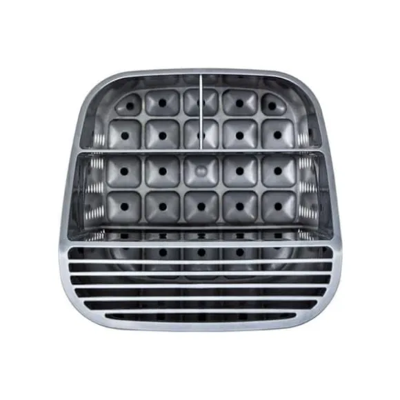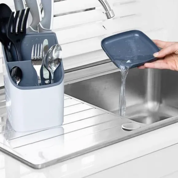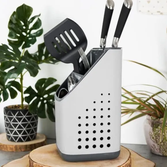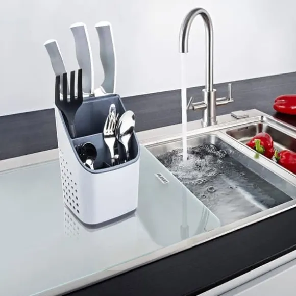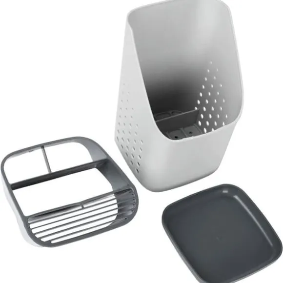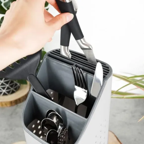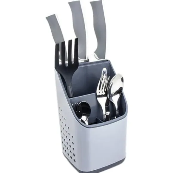 KÖK – Köksbehållare för bestick, köksredskap och knivar. Extremt lätt. Behållaren mäter 14 x 14 x 23 cm. UNIVERSAL – Kan användas som upplägg eller avlopp för tvättade bestick och köksredskap. Tack vare det kommer bestick och redskap att få sin plats. HÅLLBAR – Tillverkad av lätt, men ändå hållbart material. Behållaren är i ljusgrå och grafitfärger. PRAKTISKT – Den har 3 stora fack för skedar, knivar, gafflar, spatlar etc. och 7 fack för knivar och klyvar. AVTAGBAR STÄLL – Tack vare den speciella konstruktionen står inte redskapen i vatten, och vattnet rinner inte ut på köksbänken. Utrustad med en avtagbar bas som vatten rinner in i. Bestickavlopp, gediget gjord och samtidigt lätt. Lätt att rengöra och bekväm att använda. Den har gott om förvaringsutrymme. Den är perfekt för att förvara tvättade bestick, men också som upplägg för köksredskap. Bestickavlopp i klassisk stil. Det kommer att vara ett dekorativt element i alla kök. Original Vilde märkesprodukt. Tillverkad enligt europeiska standarder. Dominerande färg: grå