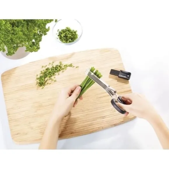 Dessa kökssaxar gör att du snabbt och exakt kan klippa persilja, gräslök, mynta eller basilika, allt utan att behöva ta fram en robot eller stor apparat. Vill du variera nöjet? Prova koriander för att upptäcka nya smaker och kittla dina smaklökar. Du kan också använda dessa saxar med 5 blad för att skära endiv och kinesisk kål i mycket tunna skivor,…