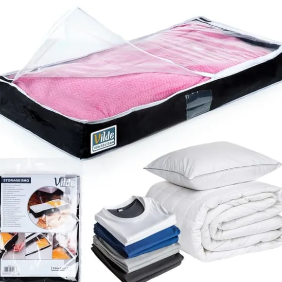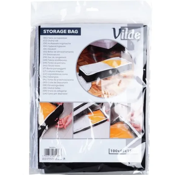 Ett användbart sängkläderöverdrag. Tillverkat av slitstarka material. Perfekt för förvaring av filtar, kuddar, kläder och andra textilier. Överdraget är låsbart och skyddar förvarade föremål från fukt och mal. Det kan användas för att organisera utrymme i garderoben eller under sängen. Original Vilde-produkt. Tillverkad i enlighet med europeiska standarder.