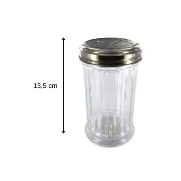 BESKRIVNING: Parmesan- eller florsockerströare i glas med lock i rostfritt stål. Det tjocka siktet på denna ströare gör att parmesan eller mandel- eller kokospulver kan passera. LILLA +: Ströaren är ett elegant redskap som lyfter din dukning eller hylla förutom att vara användbar för att strö florsocker över dina våfflor eller för att göra parmesanrisotto. SAMMANSÄTTNING: Glas, rostfritt stål. DIMENSIONER: 13,5 x 7,5 x 7,5 cm. INNEHÅLL: 1 ströare för parmesanrisotto. Detta köksredskap är en parmesanströare och används för att hälla din riven parmesan på din tallrik eller maträtt. Med denna parmesanströare kan du riva din egen ost och sedan förvara den i denna burk så att du snabbt kan använda den. Parmesan används ofta i Caesar-sallad, i risotto, i pasta osv. Detta köksredskap kan användas för att innehålla andra livsmedel än parmesan, och särskilt pulver. Du kan lägga i kakao, florsocker, mandelpulver, mjöl och annat i denna ströare. Fackelmann Frankrike är ett företag som specialiserar sig på distribution av köks- och bakredskap samt bakformar och plåtar. Företaget försöker ge en viss lätthet i hur var och en lagar mat med sina smarta redskap. Köksredskapen från Fackelmann Frankrike erbjuds till alla typer av kockar för enkel och daglig användning. Vispar, spatlar, slevar, skalare, skärbrädor och mycket mer står till ditt förfogande för att förbereda läckra och alltid mer originella recept.