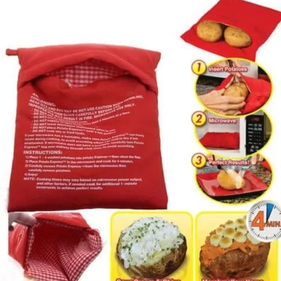 Potatis Röd påse Mikrovågsugn Potatis Spis Perfekt bakad potatis på bara 4 minuter Användbart matlagningsverktyg för kvinnor Beskrivning: Perfekt bakad potatis på bara 4 minuter med …Se presentation