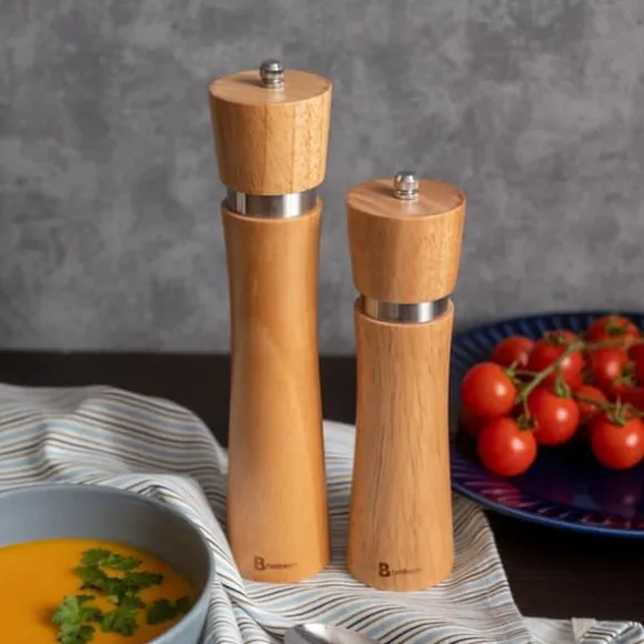Set med eleganta peppar- och saltkvarnar Tillverkade av massivt bambuträ Keramisk slipmekanism med justerbar sliptjocklek Höjd: 21 cm, 26 cm Diameter: 5,5 cm