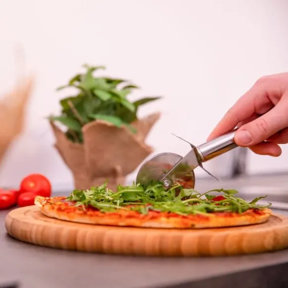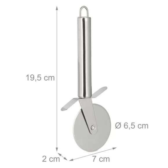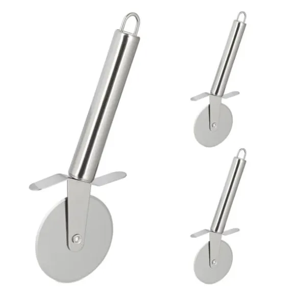 Detta praktiska set med tre pizzaskärare är perfekt för att enkelt skära pizza eller tarte flambée i jämna bitar. Det vassa bladet i rostfritt stål och det lätta handtaget säkerställer bekväm användning, medan det inbyggda fingerskyddet ökar säkerheten. Skärarna tål maskindisk för enkel rengöring och kan smidigt hängas upp när de inte används.