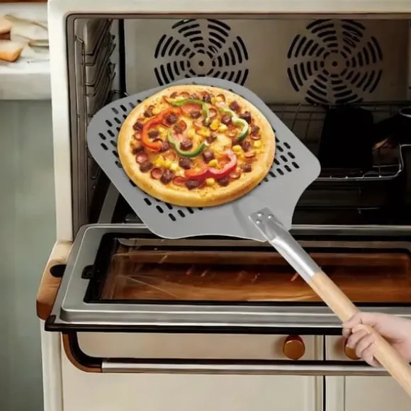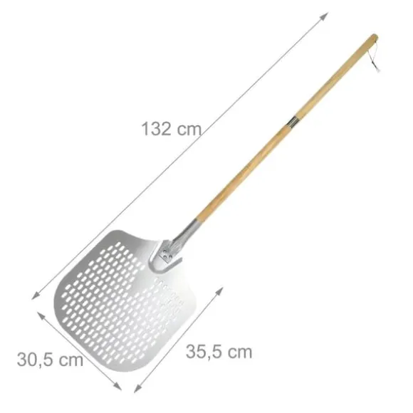 Denna perforerade pizzaspade är utformad för att enkelt glida under pizzor och bakverk, vilket tillåter mjöl att falla igenom och förhindrar att det bränns. Dess trähandtag kan justeras till två längder för komfort och säkerhet, vilket gör den mångsidig för pizza-, bröd- och flamkuchenberedning.