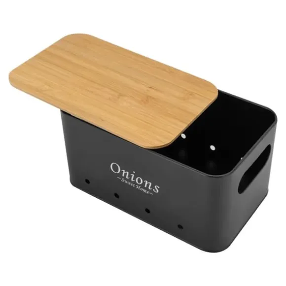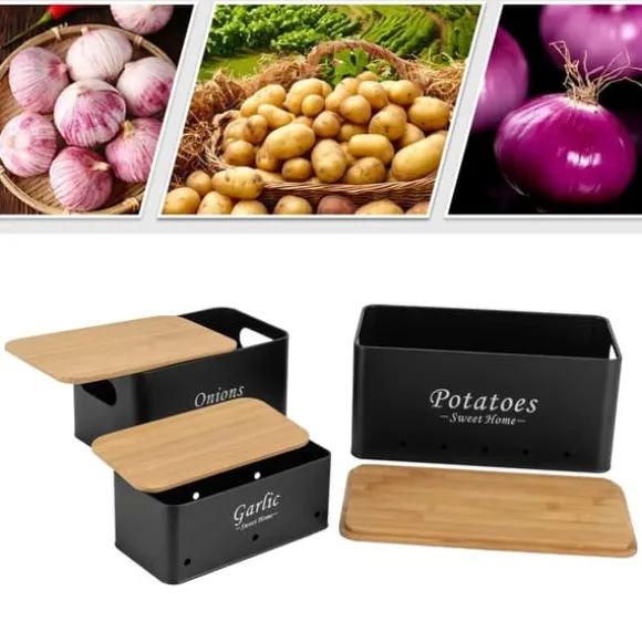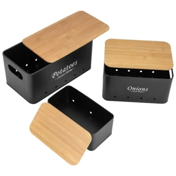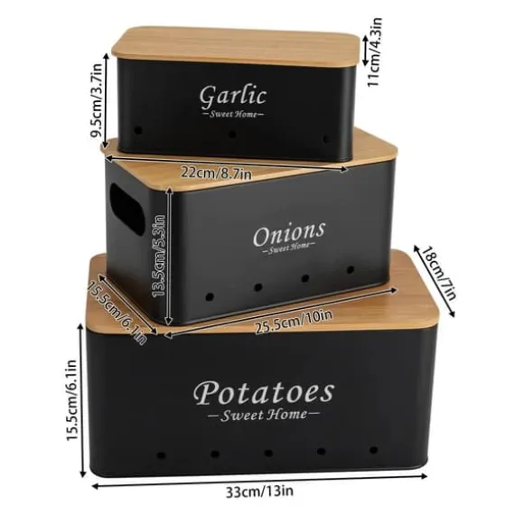 Elegant förvaring för köketHåll ordning på potatis, lök och vitlök med detta rektangulära set i kolstål och bambu i stilren svart färg. Tre storlekar gör det lätt att sortera, bevara fräschör och hålla köket prydligt – hållbart, praktiskt och snyggt.