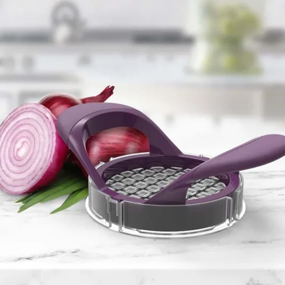 Skala löken och lägg den på brickan. Pressa hackaren med båda händerna över löken så att knivarna skär igenom löken och ända ner i spåren på brickan.
