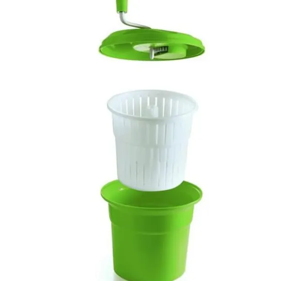 Manuell centrifug för torkning av tvättade löv. Funktionsprincipen är att placera produkten inuti korgen, som faller in i en roterande virvel tack vare mekanismen för utväxlingsförhållanden när veven vrids. Vattnet faller till botten av hinken och tas bort från den med hjälp av vattendräneringssystemet. Den är tillverkad av polyamid och polypropen som är godkänd för kontakt med livsmedel, så det finns ingen migration av antinäringsämnen. Den tål diskmaskin.