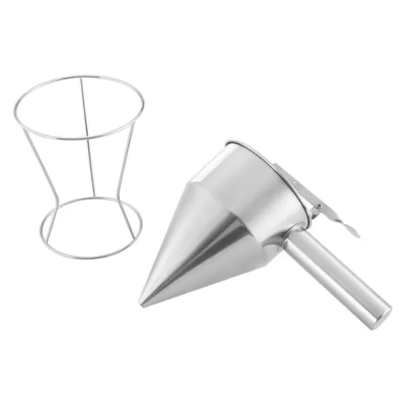 Såsdispensern är gjord av rostfritt stål. Tack vare materialet som används är det motståndskraftigt mot fukt, höga temperaturer och mekaniska skador (t.ex. blåmärken). Den släta ytan på RCFT-1.3-tratten är lätt att rengöra. En stor kapacitet (1,3 liter), en gummiplugg och ett stativ på vilket Royal Catering sås- och toppingsdispenser kan placeras vid behov, är element som påverkar användarvänligheten.