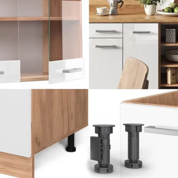 R-Line kök, 240 cm, PT Marmor, Blank vit/Gyllene ek, Vicco
