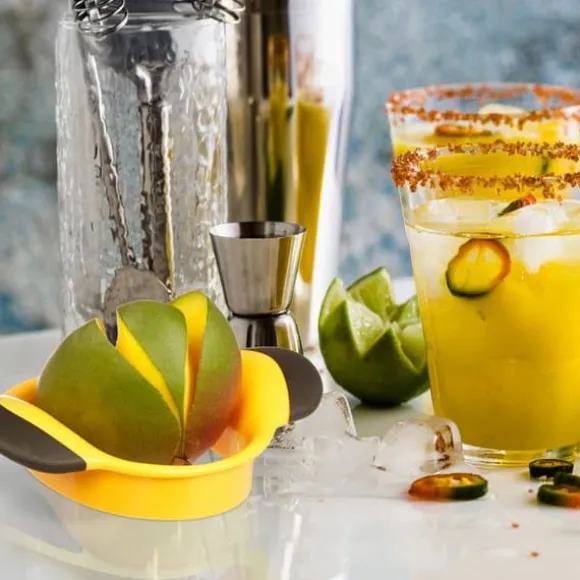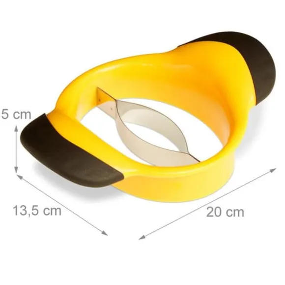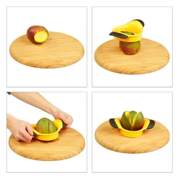 Effektivt separera mango kärnan från fruktköttet? Inga problem med den professionella mangoskäraren! Klipp helt enkelt av mangoens svans och tryck ner skäraren i frukten, med spetsen neråt. Den vassa kniven i rostfritt stål delar mangon i två halvor på några sekunder. Detta sparar din kök från oreda. Du får mer fruktkött och därmed en större njutning av smaken. De halkfria handtagen säkerställer en säker hantering.