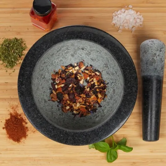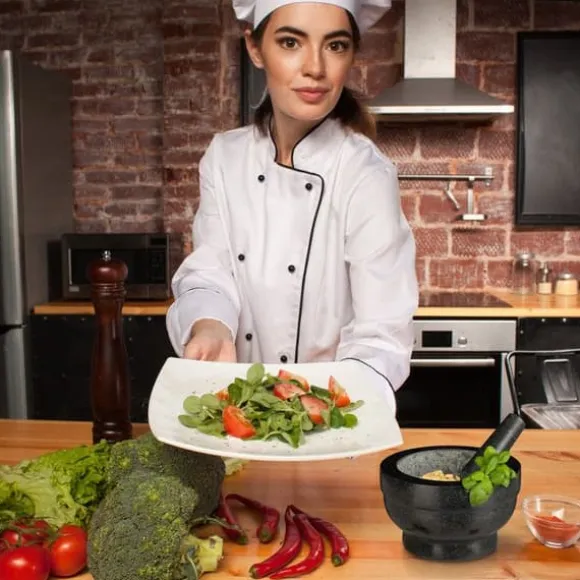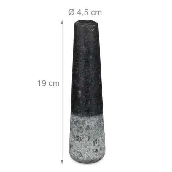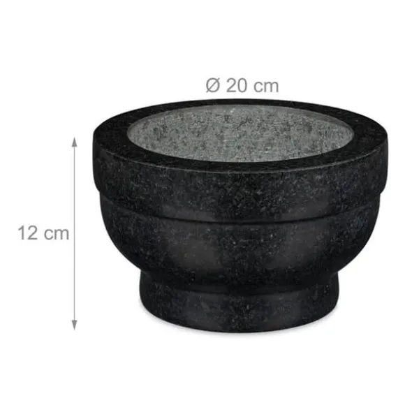 Mortar och pistill Morteln för kryddor har sin plats i varje kök! Storleken på morteln gör det möjligt att mala en större mängd kryddor eller nötter samtidigt. I sin optiska effekt övertygar morteln med sin tidlösa design och grå granit. Den inre ytan på morteln och änden av pesteln är rugga, vilket möjliggör en god extrahering av aromerna vid malning. Förbered genast dina egna kryddblandningar, läckra dippar eller peston. Eftersom granit är en naturprodukt kan färg och struktur variera, vilket gör att produkten kan ha ett annat utseende än på bilderna. Observera: Skölj med vatten och, om nödvändigt, med lite grovt salt för att ta bort rester från tillverkningen innan första användning.