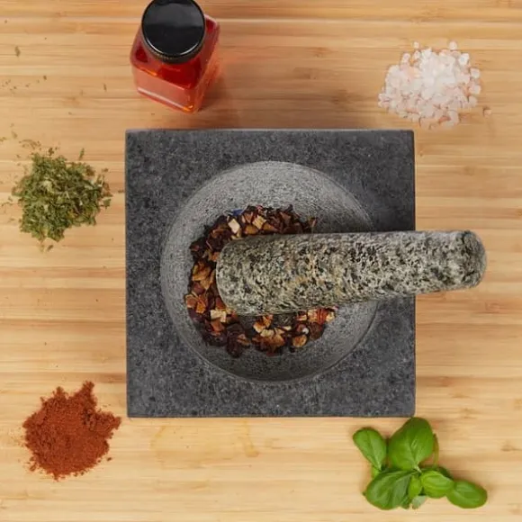 Skapa dina kryddblandningar som bas för dina marinader, såser och dips. Med detta värdefulla set mortel och stamphälle finns det inga begränsningar för din kulinariska fantasi. Mortel för kryddor och stamphälle är i granit, en slitstark natursten med låg slitage. Medan de grova ytorna möjliggör ett snabbt resultat ger de polerade ytorna en behaglig känsla. Den höga vikten säkerställer god stabilitet.