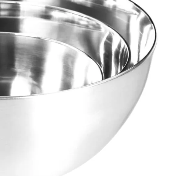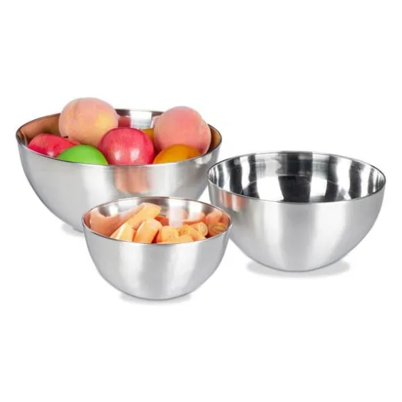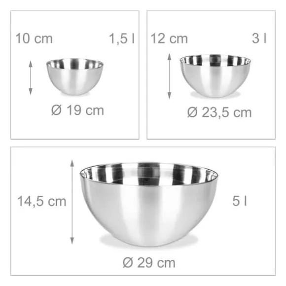 Denna uppsättning innehåller 3 blandningsskålar i rostfritt stål som är användbara för ditt kök. Använd dessa tre skålar i olika storlekar för att förbereda en tårta, göra en sallad eller servera små snacks. Den matta utsidan är modern och den glänsande insidan är elegant på ditt bord. Stapla skålarna ovanpå varandra när du förvarar dem för att spara plats.