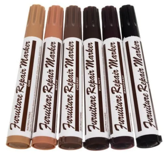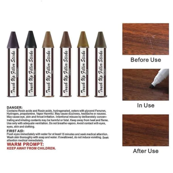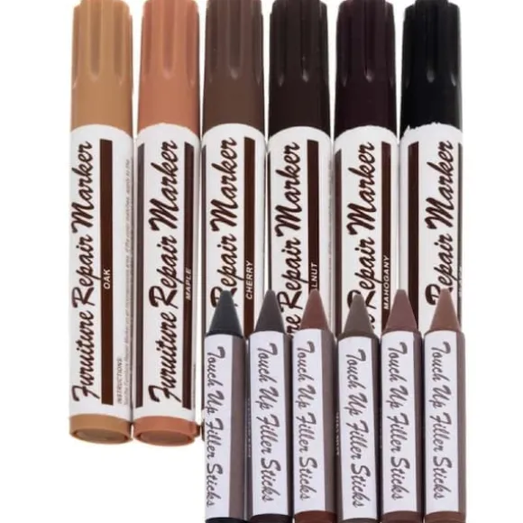 Reparationskit med 12 Pennor För Repiga Möbler & Golv. Med dessa möbelpennor tar du snabbt och enkelt bort repor och skador på möbler, golv och paneler. Använd vaxkritan för att fylla i skadan och måla sedan över med möbelreparationspennan i samma färg. Perfekt för att laga småskador och repor på möbler, dörrar, paneler och andra träprodukter. Ge dina möbler nytt liv snabbt, enkelt och billigt.