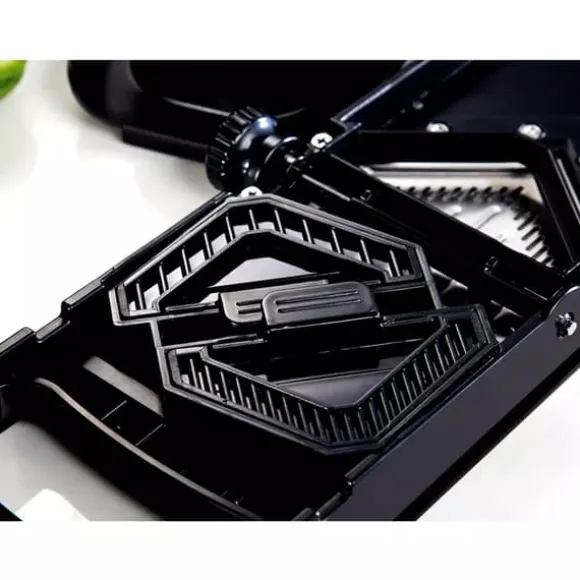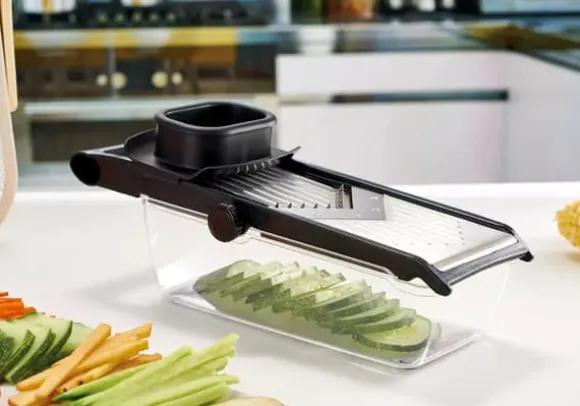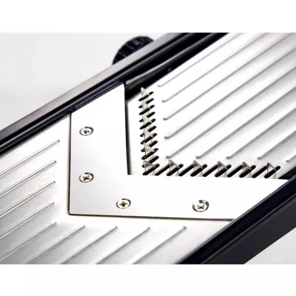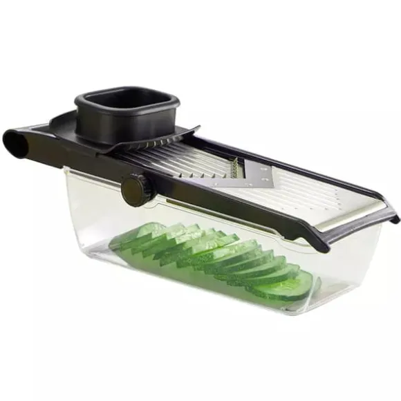 En manuell mandolin grönsaksskärare är perfekt att använda i catering och hemma när man skär mindre mängder grönsaker. Egenskaper: – V-formad knivskärare, skär grönsaker enkelt och snabbt, – Vridknapp för att justera bladets position: fem växlar: Läge 0- Bladet är i samma nivå / platt mot skärytan för att undvika skador vid beröring av V-bladet. Se alltid till att ställa in 0-läget efter användning. – Två skär med kniv för Julienne-skivor 3 mm och 6 mm. – Bladen kan förvaras i facket i botten av rivaren, bekväm förvaring – Transparent behållare för rivna grönsaker, – Fingerskydd – grönsakspress. Pressa aldrig grönsaker med handen/fingrarna – använd en press för detta. – TPR termoplastgummikudden gör skärmaskinen stabil. – Tål diskmaskin – Livsmedelssäker, BPA-fri – Storlek 32 x 11,5 x 13 cm