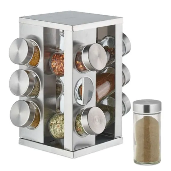 Silverfärgad kryddkarusell med 12 kryddburkar Tid är avgörande när man lagar mat. Dina favoritkryddor bör finnas nära till hands. Den roterande kryddkarusellen ger dig enkel tillgång till upp till 12 kryddor. Inget mer roterande i köksskåp eller den obehagliga överraskningen av en pepparkar. De genomskinliga burkarna ger 24-timmars synlighet av kryddorna. Locken i rostfritt stål garanterar att aromen bevaras. För att fylla på, ta bara bort plastkarusellen. Denna eleganta kryddhylla finns i modern silverfärg.