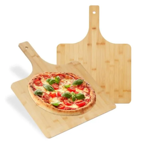 Skjut in dina pizzor i den varma ugnen med dessa XXL-pizzaspadar, ett set om två – precis som på en riktig pizzeria! Allt sitter säkert och halkfritt på pizzaspadarna. Tack vare de tillplattade kanterna kan du enkelt nå under den råa eller bakade degen och lyfta pizzorna med lätthet. Ugnsspadarna är gjorda av bambu och tack vare hålet i handtaget kan du enkelt och dekorativt hänga upp dem i köket. Använd dem gärna till bröd eller tarte flambée.
