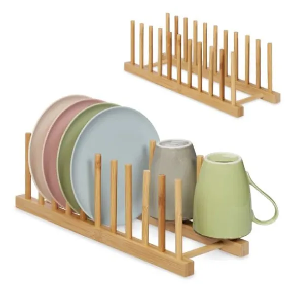 Diskställ för 10 tallrikar, hyllor eller lock i diskmaskin. För ett enpersonshushåll är det ofta inte värt att köpa en diskmaskin. Detta praktiska diskställ torkar disken snabbare, vilket gör handdiskning till en barnlek. Varje diskställ rymmer glas, koppar eller 10 tallrikar med lock. Det mångsidiga lockstället är också perfekt som hyllhållare på din bänkskiva eller som en lådinsats för tallrikar. För att installera, sätt helt enkelt in bambupinnarna i de medföljande hålen.