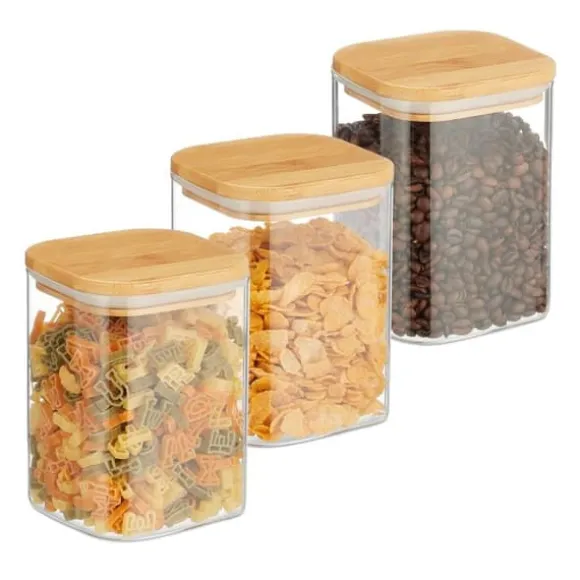Fyrkantiga förvaringsbehållare i glas Denna praktiska uppsättning med tre förvaringsbehållare i glas låter dig förvara din mat på ett platsbesparande och organiserat sätt. Oavsett om det är pasta, ris, kakor, müsli, cornflakes eller kaffebönor – dessa förvaringsbehållare i glas är mångsidiga. Müslibehållarna är gjorda av glas och har ett bambulock med en silikonring som säkerställer en lufttät försegling och håller innehållet färskt längre. Tack vare sin transparenta design är de fyllda köksförvaringsbehållarna också ett riktigt blickfång.