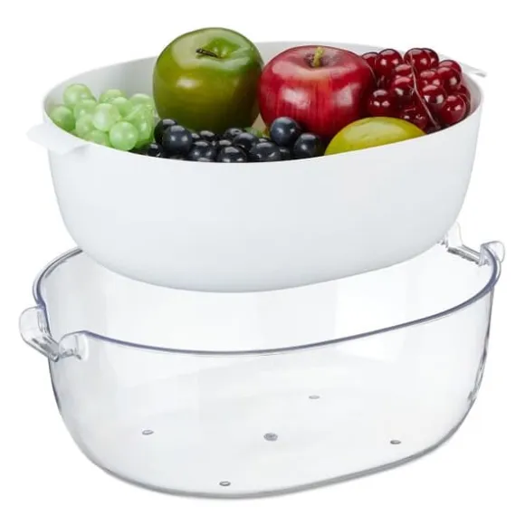 Köksdurkslag med droppbricka Denna praktiska kombination av durkslag och skål är ett praktiskt kökshjälpmedel. Använd durkslaget för att tvätta frukt och grönsaker eller häll av pasta och placera det i skålen för att rinna av. De stora öppningarna i salladsdurkslaget säkerställer perfekt dränering. Plastskålen är också idealisk som bakskål för deg eller som serveringsfat för sallader. Handtagen på durkslaget gör den enkel att transportera och bekväm att använda.