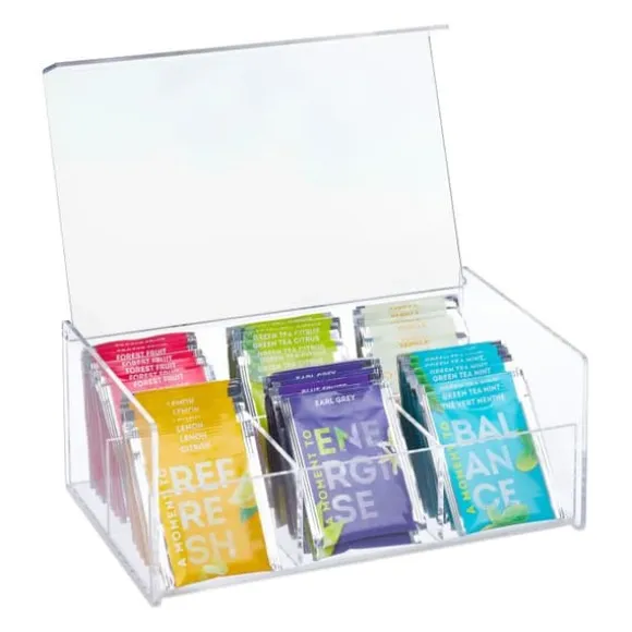 Fyrkantig tepåsehållare med 6 fack Denna tepåsehållare är det perfekta tillskottet till alla teälskares skafferi. Den har 6 fack för att prydligt förvara dina favoritteer. Den transparenta akryldesignen ger en tydlig överblick över ditt teförråd, medan det praktiska gångjärnsförsedda locket ger snabb åtkomst. Denna mångsidiga akrylbehållare är också lämplig för förvaring av bakingredienser, hantverksmaterial eller kosmetika.