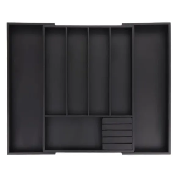 Röriga kökslådor är ett minne blott med denna besticklåda. Lådlådan, med 5 huvudfack och 2 utdragbara fack, erbjuder gott om plats för bestick, köksredskap och diverse andra kökstillbehör. Den uttagbara knivlådan rymmer enkelt upp till 4 köksknivar. Tack vare sin individuellt justerbara bredd anpassar sig besticklådan till olika lådstorlekar.