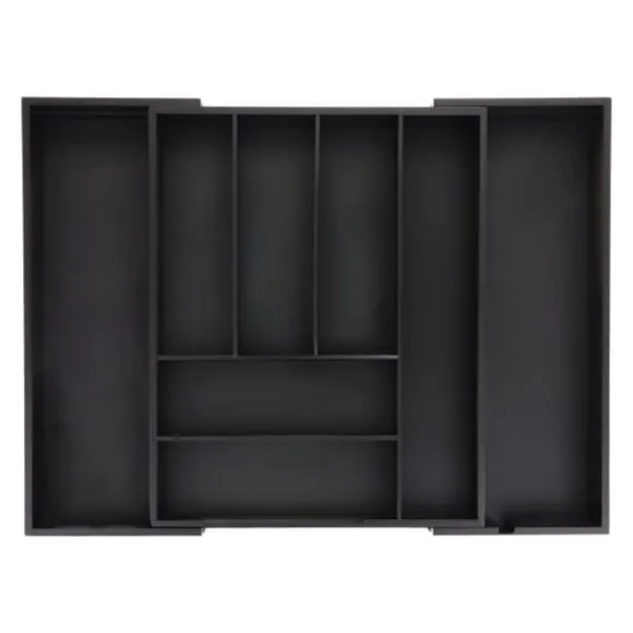 Röriga kökslådor är ett minne blott med denna besticklåda. Lådinsatsen med 6 huvudfack och 2 utdragbara fack erbjuder gott om plats för bestick, större köksknivar och diverse köksredskap. Tack vare sin individuellt justerbara bredd anpassar sig besticklådan till olika lådstorlekar. Besticklådan är tillverkad av robust bambu och MDF och imponerar med sin enkla, eleganta svarta design.