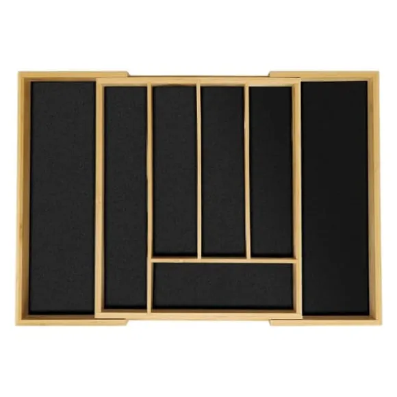 Mångsidig besticklåda i en blandning av material: Röriga kökslådor är ett minne blott med denna besticklåda. Lådlådan, med 5 huvudfack och 2 utdragbara fack, erbjuder gott om plats för bestick, större köksknivar och diverse köksredskap. Tack vare sin individuellt justerbara bredd anpassar sig besticklådan till olika lådstorlekar. Besticklådan imponerar med sin praktiska design och blandningen av naturådrad bambu och svart MDF. Obs: Mät din låda noggrant så att du enkelt får plats med lådan.