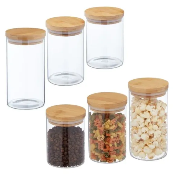 Förvaringsbehållare i 3 praktiska storlekar. Med dessa praktiska förvaringsbehållare i glas, ett set om 6, kan du förvara din mat på ett platsbesparande och organiserat sätt. Oavsett om det är pasta, ris, kakor, müsli, cornflakes eller kaffebönor, är dessa förvaringsbehållare i glas, som finns i 3 storlekar, mångsidiga. Müslibehållarna är gjorda av glas och har ett bambulock med en silikonring som förseglar behållarna lufttäta och håller innehållet färskt längre. Tack vare sin transparenta design är de fyllda köksförvaringsbehållarna också ett riktigt blickfång.
