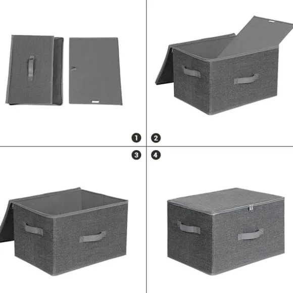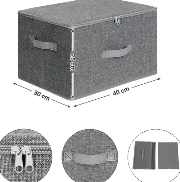 Material: Vill du hålla dina sommarkläder i gott skick till nästa sommar? Locken på dessa tyglådor har dragkedja på tre sidor och skyddar dina kläder från damm, så att du kan lägga dem på hyllan, i garderoben eller under sängen. Den linneliknande strukturen hos non-woventyget och den återhållna grå färgen ger värme och lugn till ditt rum.