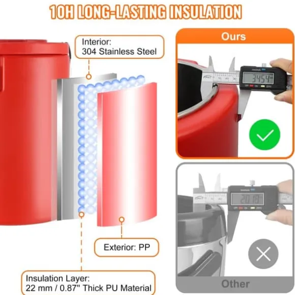 Vår varm- och kalldrycksdispenser är tillverkad av en tvåskikts rostfri stålkonstruktion med ett 22 mm tjockt PU-skumlager som ger utmärkt isolering. Den håller dina drycker varma eller kalla i upp till 10 timmar utan att behöva elektricitet eller någon annan energikälla. Håll inomhustemperaturen konstant med vårt täta lock!