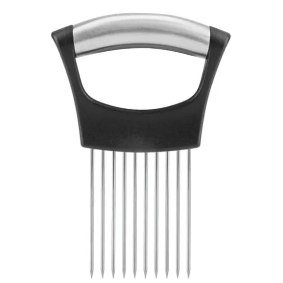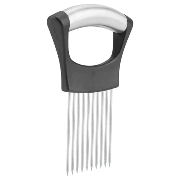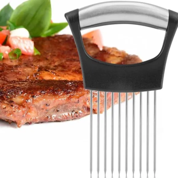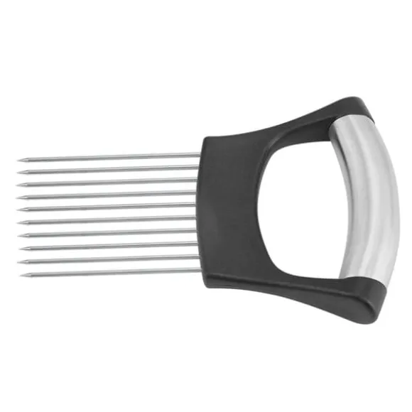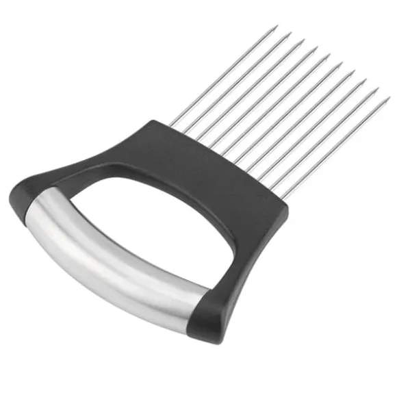 Välkommen till vår butik! Vår högkvalitativa lökskärare i rostfritt stål är utformad för hållbarhet, hälsosäkerhet och rostbeständighet. Den har 10 rostfria stålstift för att hålla löken stadigt, så att du kan skära den jämnt med en vass kniv. Detta mångsidiga verktyg kan också säkert hålla grönsaker och frukter som zucchini, gurka, tomater och mer för skivning, skärning, hackning eller skalning, och den fungerar till och med som köttskärare. Med en ergonomisk design hanterar den enkelt oskalad potatis och har halkfria, mjuka handtag för bekväm och tryckabsorberande användning. Rengöringen är enkel med en borste. Produkten är tillverkad av 304 rostfritt stål och ABS, mäter cirka 14*9,8*2 cm (5,5*3,9*0,8 tum) och levereras i silverfärg. Din beställning inkluderar en lökhållare. Nöjdhet: Våra kunder är vår högsta prioritet. Om du upptäcker några produktproblem efter att du mottagit varorna, såsom skador eller felaktig mängd varor, vänligen kontakta säljaren omedelbart. Vi gör vårt bästa för att ge dig tillfredsställande kundservice.