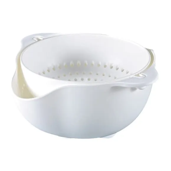 Detta smarta durkslag och medföljande skål är ett praktiskt köksredskap för att skölja eller blötlägga mat. Själva durkslaget kan rotera 360° i sina fästen, vilket gör att maten inte trillar ur när du tömmer ut vattnet. Den fungerar även som en snacksskål för till exempel jordgubbar eller annan frukt och grönt, då du smidigt kan samla blad och rester i skålen under durkslaget. Durkslaget är löstagbart för enkel rengöring.
