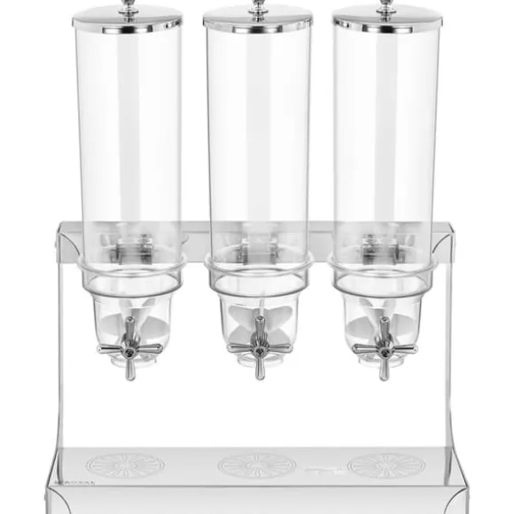 Med den praktiska müslidispensern från varumärket Royal Catering kan du lagra och enkelt portionera lösa produkter som: frukostflingor, müsli, små kex och kakor, godis, nötter, torkad frukt, kaffe, ris etc. Den kan vara till stor nytta var som helst där frukostbuffé serveras – på hotell, restauranger eller bistroer. Modellen RCCS-3.5LSS3 kännetecknas av en modern, elegant design – vilket gör den till och med till ett prydligt dekorationselement. Gästerna kan utan problem ta innehållet ut ur dispensen via tre öppningar.