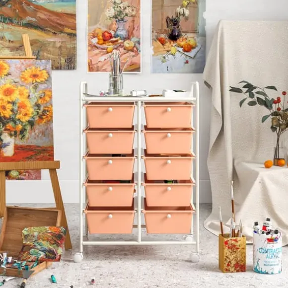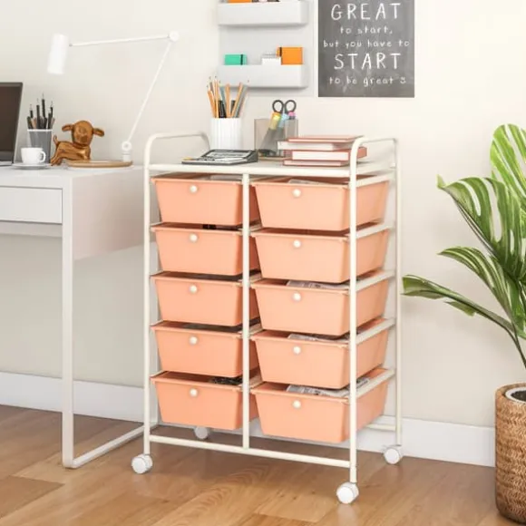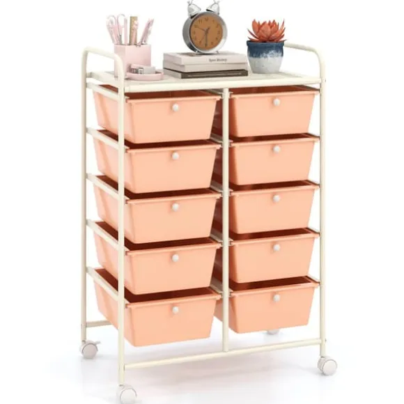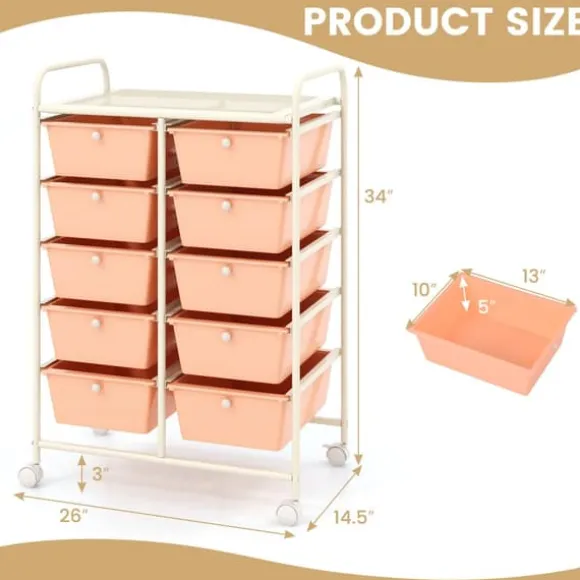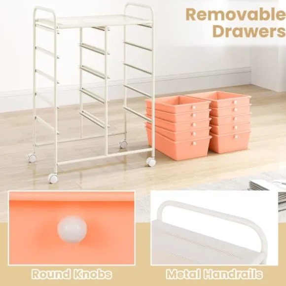 Denna rullande förvaringsvagn med 10 lådor erbjuder gott om förvaringsutrymme med avtagbara lådor och en nätplattform, vilket gör organiseringen enkel och bekväm. Den har en robust metallram, metallhandtag och låsbara hjul för stabilitet och rörlighet, lämplig för användning i hem, kontor eller klassrum.