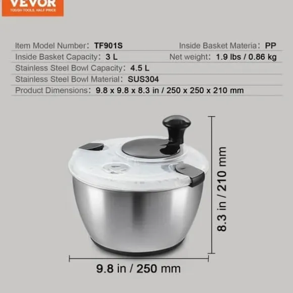 Artikelnummer: TF901S.|Skålkapacitet i rostfritt stål: 4,5L|Innerkorgskapacitet: 3L|Skålmaterial i rostfritt stål: SUS304|Innerkorgmaterial: PP.|Nettovikt: 1,9 lbs/0,86 kg|Produktmått: 9,8 x 9,8 x 8,3 tum/250 x 250 x 210 mm
