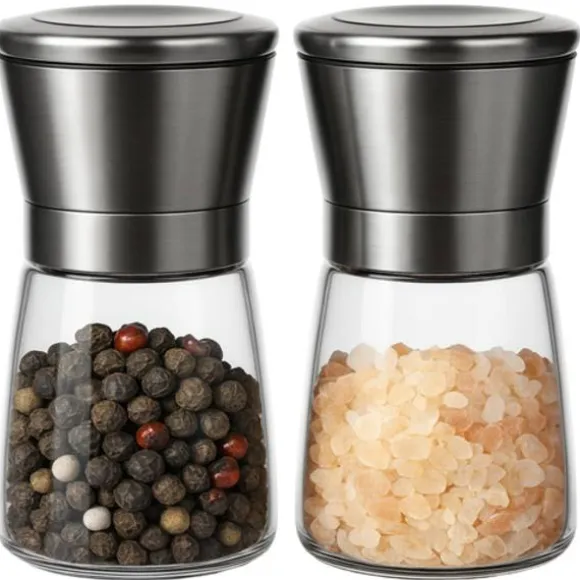 – set om 2 glas-kvarnar med keramisk mekanism – hållbara, estetiska och precisa, idealiska för salt, peppar och örter