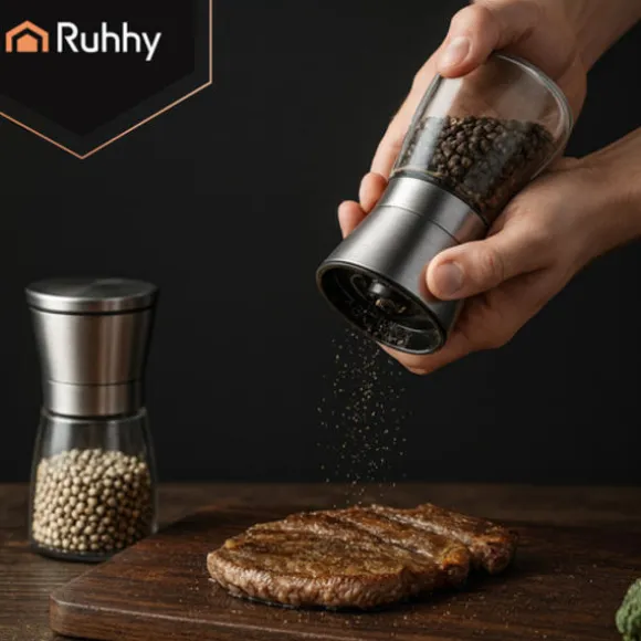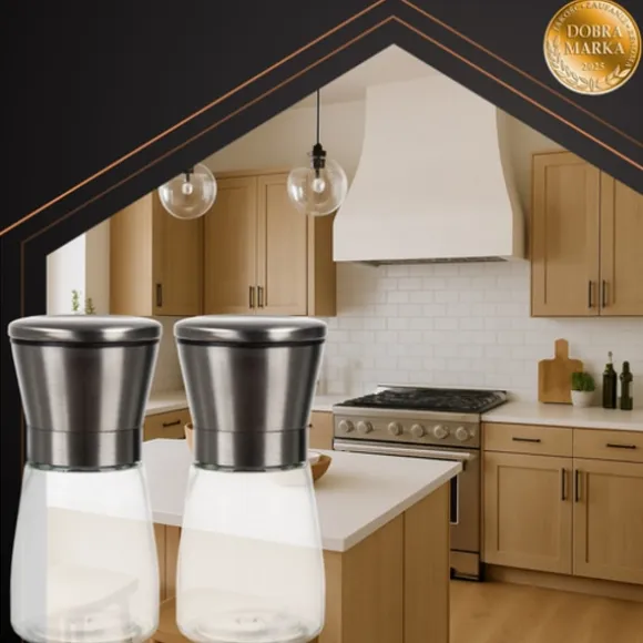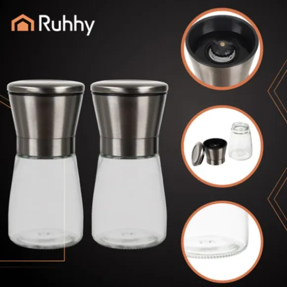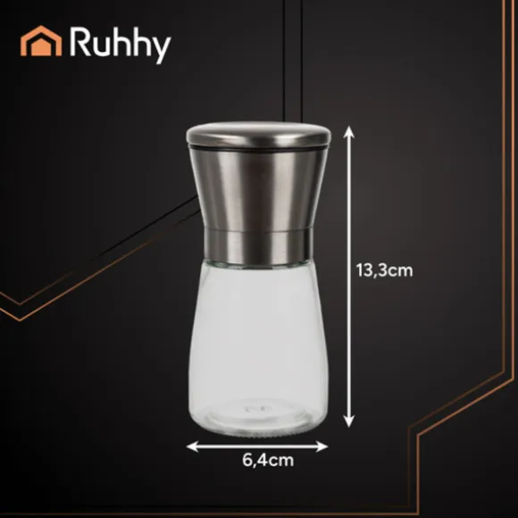 Välj stil och funktionalitet med moderna RUHHY-kvarnar. Tillverkade av transparent glas och med ett metallock, gör att du kan kontrollera mängden kryddor och samtidigt ser eleganta ut i vilket kök som helst. Den keramiska malningsmekanismen säkerställer precis, manuell malning och frigör den fulla smaken av varje maträtt. Detta praktiska och stiliga set är perfekt för både vardagsmatlagning och eleganta dukningar – för den verkliga smaken börjar med nymalda kryddor.