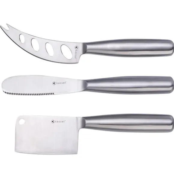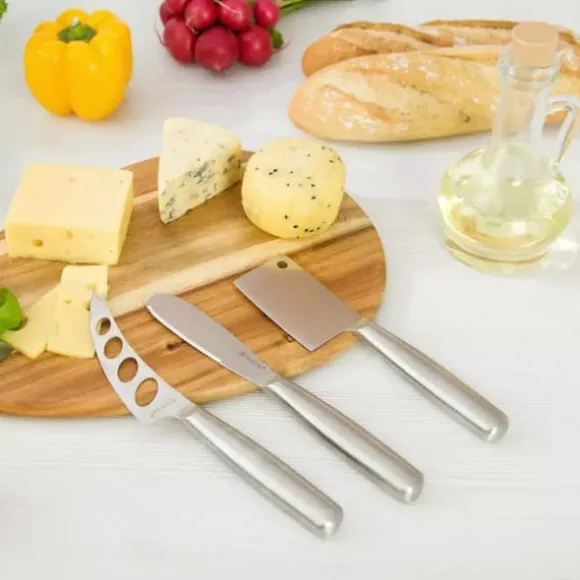 Uppsättning ostknivar i stål. Den kan serveras med en ostbricka så att gästerna kan portionera ut den som de vill. – OSTKNIV: Tandad, för att skära ost, för att sprida färskost och smör, även för att skära tomater eller pizza etc., mycket praktiska köksredskap för matlagning. – KNIV FÖR MJUKA OCH BLÅOSTAR med en gaffelspets som även fungerar som en gaffel. Tack vare hålen och den rundade formen är den perfekt för att skiva ost. Lätt och lätt att förvara i ett köksskåp. -OSTKLIPPARE för alla typer av hårda och halvhårda ostar. Den ergonomiska formen ger rätt balans mellan handtaget och det tunna bladet. Perfekt för servering, skärning, delning och är lätt att förvara.