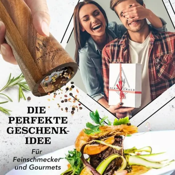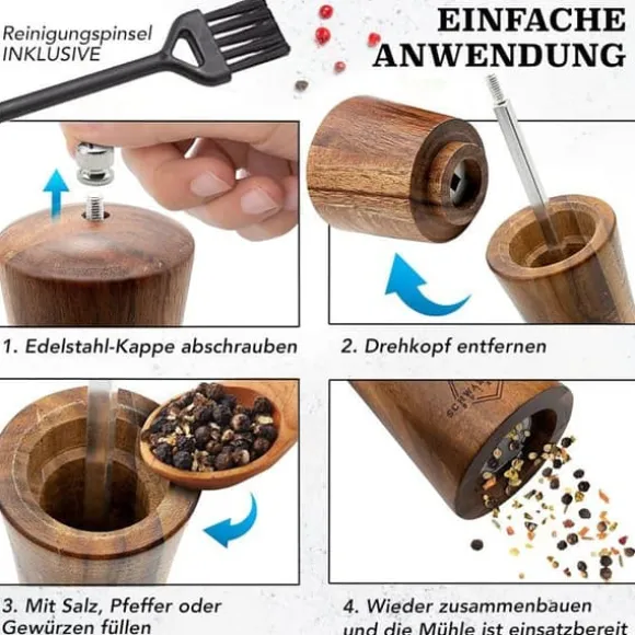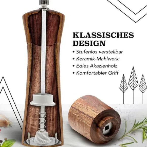 Denna set med peppar- och saltkvarnar i akacieträ kombinerar tidlös design och funktionalitet. Tillverkade med ett justerbart keramiskt malverk garanterar de en perfekt krossning. Lätta att använda, de inkluderar en påfyllningssked och en rengöringsborste. Perfekt som present för alla tillfällen, en receptbok ingår också.