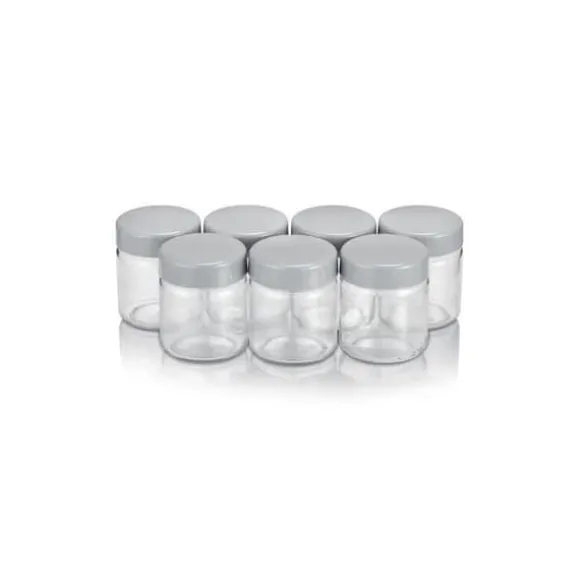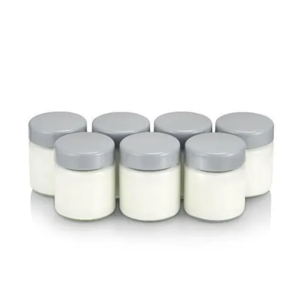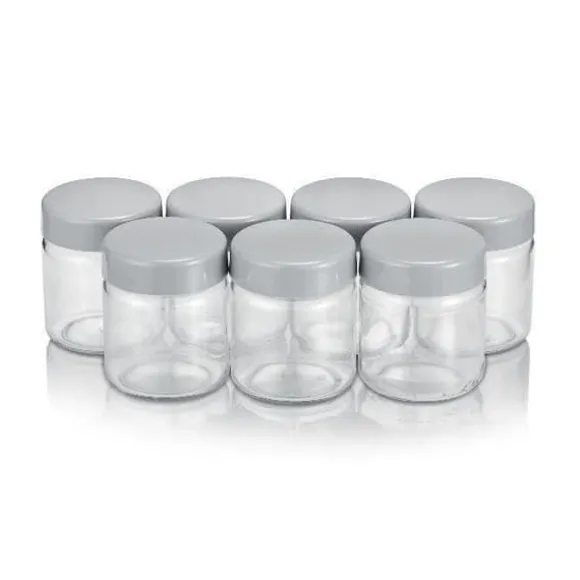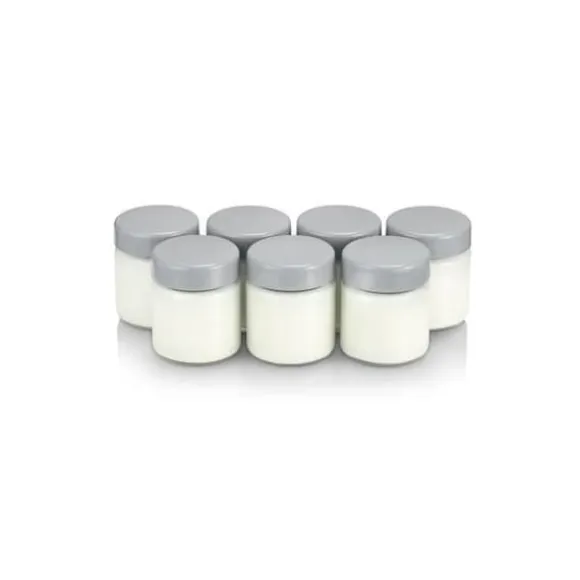 Set med 7 premiumglasyoghurtkrukor med en kapacitet på 150 ml med gråa skruvlock. Lämplig för alla SEVERIN yoghurttillverkare.