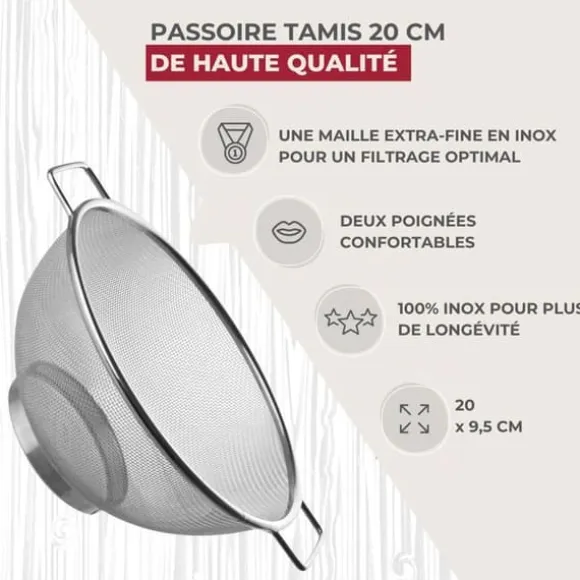 Denna 20 cm siktsil av rostfritt stål är idealisk för att dränera frukt, grönsaker, pasta och för att sikta mjöl, kakao och socker. Praktisk och mångsidig, det gör vardagsmatlagning enklare.