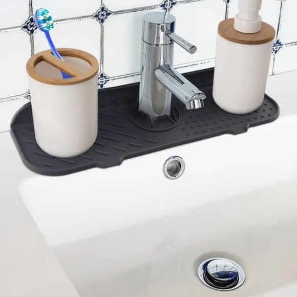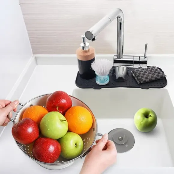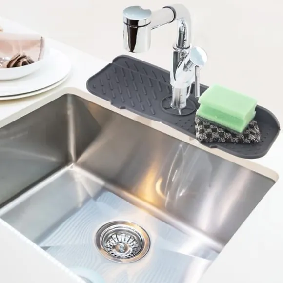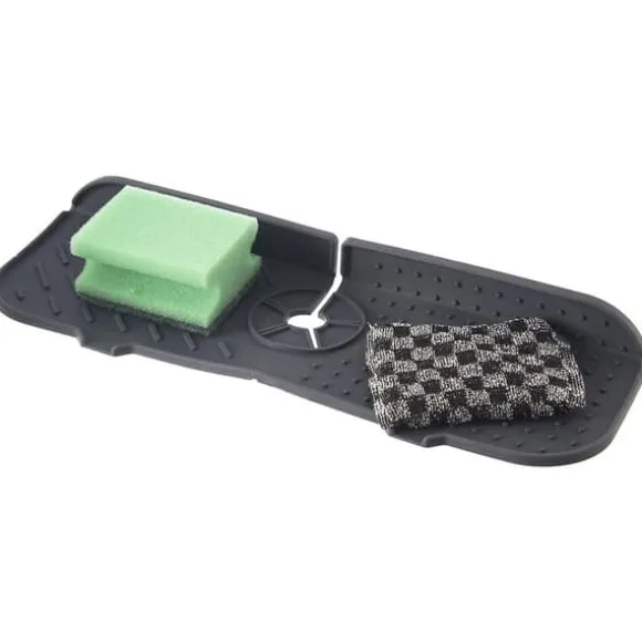 FUNKTIONELL – Du kan säkert placera en disksvamp, diskmedel, borste, diskbänkspropp etc. på mattan. Den fäster ordentligt på kranen, tack vare utskärningen som anpassar sig till alla kranar.